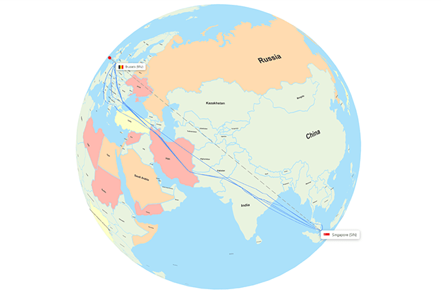 Flights from Brussels (BRU), Belgium to Singapore (SIN), Singapore illustrated on a map. Based on 36 recorded flights, the distance can vary between 6783 and 6916 miles.