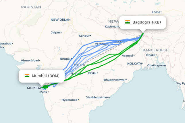 Flights from Bagdogra (IXB), India to Mumbai (BOM), India illustrated on a map. Based on 15 recorded flights, the distance can vary between 1155 and 1331 miles.