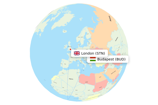 Flights from London (STN), United Kingdom to Budapest (BUD), Hungary illustrated on a map. Based on 31 recorded flights, the distance can vary between 919 and 982 miles.